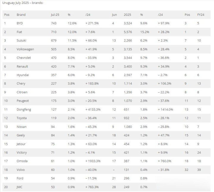 7月, 乌拉圭新车销量大幅上涨, 恭喜比亚迪强势登顶, 奇瑞第八